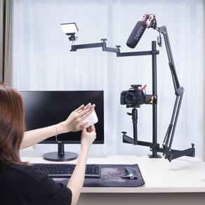 Suporte multiuso para gravações Fornece soluções perfeitas de gravação e transmissão , tornando a transmissão mais fácil. Adapte-se às necessidades de vários cenários, como educação online, reunião de empresa, gravação , streaming de música/entretenimento/jogo. Ideal para uso em diversas superfícies com bordas, mesas de rádio, studios, home studios, TVs, etc. Solução perfeita para músicos, cantores, Youtubers, gamers, produtores, narradores, entre outros profissionais - Excelente estabilidade e capacidade de carga. - Proporciona um visual limpo e para a sua estação de trabalho. - Não ocupa o espaço útil em excesso de uma mesa ou superfície, pode ser removido facilmente. - Peso: 2,5 kg - Material: Alumínio Componentes: 1 x barra central com morsa abertura máxima, 5 cm 1 x extensor para barra central, rosca superior 1/4 . Altura do eixo central, com o extensor: 77 cm 2 x braço lateral, comprimento: 50 cm, rotação 360 graus. 1 x braço lateral, com rosca 1/4 para equipamentos de foto/vídeo, comprimento: 75 cm, rotação 360 graus. 1 x braço articulado, com . 1 x cabeça esférica panorâmica removível de 360, rosca 1/4 1 x extensor de altura ajuste, 7,5 cm , rosca 1/4 1 x sapata de engate rápido, rosca 1/4 1 x cold shoe mount, rosca 1/4