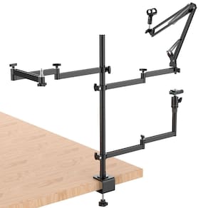 Suporte multiuso para gravações Fornece soluções perfeitas de gravação e transmissão , tornando a transmissão mais fácil. Adapte-se às necessidades de vários cenários, como educação online, reunião de empresa, gravação , streaming de música/entretenimento/jogo. Ideal para uso em diversas superfícies com bordas, mesas de rádio, studios, home studios, TVs, etc. Solução perfeita para músicos, cantores, Youtubers, gamers, produtores, narradores, entre outros profissionais - Excelente estabilidade e capacidade de carga. - Proporciona um visual limpo e para a sua estação de trabalho. - Não ocupa o espaço útil em excesso de uma mesa ou superfície, pode ser removido facilmente. - Peso: 2,5 kg - Material: Alumínio Componentes: 1 x barra central com morsa abertura máxima, 5 cm 1 x extensor para barra central, rosca superior 1/4 . Altura do eixo central, com o extensor: 77 cm 2 x braço lateral, comprimento: 50 cm, rotação 360 graus. 1 x braço lateral, com rosca 1/4 para equipamentos de foto/vídeo, comprimento: 75 cm, rotação 360 graus. 1 x braço articulado, com . 1 x cabeça esférica panorâmica removível de 360, rosca 1/4 1 x extensor de altura ajuste, 7,5 cm , rosca 1/4 1 x sapata de engate rápido, rosca 1/4 1 x cold shoe mount, rosca 1/4