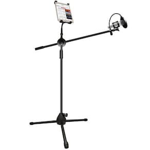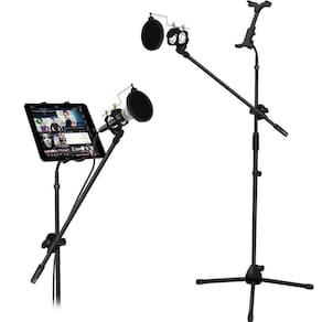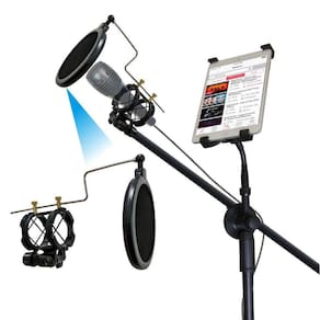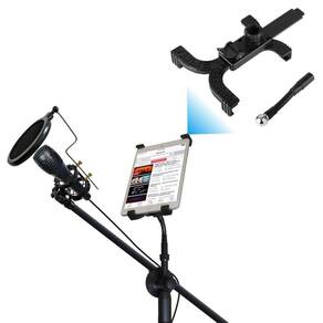 Pedestal para microfone + suporte para tablet + shock mount + pop filter.