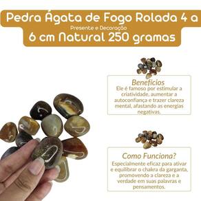 Pedra Ágata de Fogo Rolada 4 a 6 cm Natural 250 gramas Pedra Ágata de Fogo Rolada Natural - 4 a 6 cm - 250 gramas A Ágata de Fogo é conhecida por suas propriedades de fortalecimento físico e emocional. Ela é ideal para quem deseja se sentir mais energizado e confiante, além de promover um ambiente mais harmonioso e livre de energias negativas. Benefícios da Pedra Ágata de Fogo Rolada: Aumento de Energia e Vitalidade: A Ágata de Fogo é excelente para revitalizar as energias, trazendo força e vigor tanto para o corpo quanto para a mente. Equilíbrio Emocional: Esta pedra ajuda a equilibrar as emoções, promovendo a estabilidade emocional e o alívio de tensões. É especialmente útil em momentos de e ansiedade. Proteção Energética: A Ágata de Fogo é uma pedra de proteção, criando uma barreira contra energias negativas e influências externas indesejadas, tornando o ambiente mais seguro e positivo. Fortalecimento do Corpo e da Mente: Esta pedra também está associada ao fortalecimento do sistema imunológico e à recuperação energética, proporcionando sensação de bem-estar e motivação. Observações Importantes: Por ser uma pedra natural, a Pedra Ágata de Fogo Rolada pode apresentar variações nas cores, padrões e tamanhos. Contudo, garantimos que todas as pedras são cuidadosamente selecionadas para garantir a melhor qualidade e autenticidade. Tamanho: 4 a 6 cm Peso Total: 250 gramas. Enviamos sua encomenda em até 24 horas após a confirmação do pagamento Caso tenha dúvidas, envie-nos uma mensagem, e responderemos rapidamente para te ajudar Marca: Não Informado