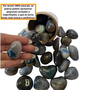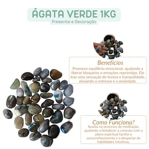 As pedras incluídas no pacote possuem tamanhos variando entre 2 e 4 cm. Para garantir o peso de 1KG, o pacote será composto predominantemente por pedras de Ágata Verde de excelente qualidade, podendo conter também pedras de outros tipos de Ágata ou cristais de qualidade similar, assegurando o peso anunciado.