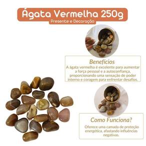 Pedra Ágata Vermelha 1 a 2 cm Rolada 250 g Natural Ágata Vermelha Rolada Tipo da Pedra: Ágata Vermelha Rolada A Ágata Vermelha é uma pedra fascinante com cores vibrantes, que vão do vermelho profundo ao laranja, criando um visual acolhedor e energizante. Ela é altamente apreciada por suas propriedades de energização, proteção e estabilidade, sendo ideal para quem busca força, coragem e equilíbrio em sua vida. Propriedades Curativas da Ágata Vermelha: Equilíbrio Emocional: Esta pedra ajuda a estabilizar as emoções, promovendo uma sensação de segurança e confiança. Ela reduz o e a ansiedade, proporcionando equilíbrio emocional e clareza mental. A Ágata Vermelha também auxilia na liberação de emoções reprimidas e bloqueios emocionais. Aumento da Autoconfiança e Determinação: A Ágata Vermelha fortalece a autoconfiança, ajudando a pessoa a tomar decisões assertivas e a manter-se firme em suas escolhas. Ela também é excelente para aumentar a determinação e a força de vontade, especialmente em momentos de desafio ou mudança. Peso do Pacote: 250g peso garantido Observações Importantes: Por ser uma pedra natural, a Ágata Vermelha pode apresentar variações nas cores, tamanhos, formatos e peso das pedras. No entanto, garantimos que todas as pedras são cuidadosamente selecionadas por nossos especialistas para oferecer a melhor qualidade e pureza possíveis. As pedras incluídas no pacote possuem tamanhos variando entre 1 e 2 cm. Para garantir o peso de 250g, o pacote será composto predominantemente por pedras de Ágata Vermelha de excelente qualidade, podendo conter também pedras de outros tipos de Ágata ou cristais de qualidade , assegurando o peso anunciado. Qualidade Garantida: As pedras são polidas e selecionadas especialmente para colecionadores e entusiastas de cristais. Enviamos o seu pedido em até 24 horas após a confirmação do pagamento Ficamos à disposição para esclarecer qualquer dúvida antes ou após a compra. Nossa prioridade é garantir sua satisfação Marca: Não Informado Ean: 7894135847448