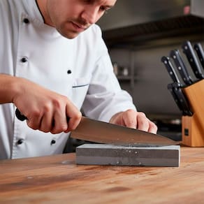 Recupere o fio ideal de facas e tesouras com esta pedra de afiação dupla face.