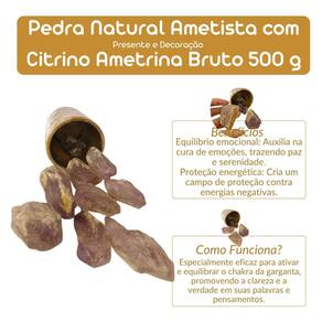 Pedra Natural Ametista com Citrino Ametrina Bruto 500 gramas Pedra Natural Ametista com Citrino Ametrina Bruta - 500g A Ametrina é uma pedra natural rara e poderosa que combina as energias da Ametista e do Citrino, promovendo equilíbrio entre a espiritualidade, clareza mental e prosperidade. No formato bruto, mantém sua energia intensa e autêntica, sendo ideal para colecionadores, terapeutas e entusiastas de cristais. Benefícios da Ametrina