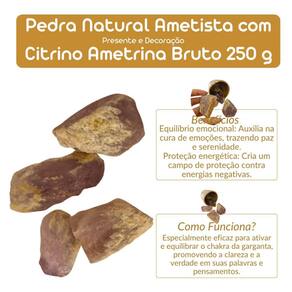 Pedra Natural Ametista com Citrino Bruto 250g Pedra Natural Ametista com Citrino Ametrina Bruta - 250g A Ametrina é uma pedra natural rara e poderosa que combina as energias da Ametista e do Citrino, unindo a espiritualidade e a clareza mental com a prosperidade e a vitalidade. No formato bruto, mantém sua energia intensa e natural, sendo ideal para colecionadores, terapeutas e entusiastas de cristais. Benefícios da Ametrina