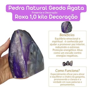 Pedra Natural Geodo Ágata Roxa 1,0 kilo Decoração Pedra Natural Geodo Ágata Roxa - 1,0 kg O Geodo de Ágata Roxa é uma peça natural única, formada ao longo de milhares de anos. Seu interior cristalizado exibe tons vibrantes de roxo, tornando-se uma excelente opção para decoração, meditação e energização de ambientes. Benefícios da Ágata Roxa