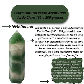 Pedra Natural Ponta Aventurina Verde Claro 100 a 200 gramas Pedra Natural Ponta Aventurina Verde Claro 100 a 200 gramas A Ponta Aventurina Verde Claro de 100 a 200 gramas é uma verdadeira joia da natureza, com sua cor suave e refrescante que traz serenidade e equilíbrio para qualquer ambiente. Esta pedra natural é perfeita para quem deseja um toque de tranquilidade, prosperidade e harmonia em seu espaço, seja como peça decorativa ou amuleto energético. Com suas propriedades curativas e calmantes, a aventurina verde claro é conhecida por promover a harmonia emocional, a abundância e o bem-estar. Sua energia suave favorece o equilíbrio interior e o alinhamento dos chakras, criando um ambiente de paz e positividade. Benefícios da Ponta Aventurina Verde Claro 100 a 200 gramas : Equilíbrio e Harmonia Emocional: A aventurina verde claro é especialmente eficaz no alívio do e da ansiedade, promovendo uma sensação de tranquilidade e serenidade. Ela ajuda a equilibrar as emoções e criar uma atmosfera harmoniosa. Atração de Prosperidade: Esta pedra é considerada um amuleto da sorte, especialmente no que diz respeito a atrair abundância, prosperidade e novas oportunidades financeiras. A energia da aventurina verde favorece o crescimento e a realização de objetivos. Abertura do Coração: A aventurina verde claro está associada ao chakra do coração, promovendo o amor, a compaixão e o perdão. Ela facilita a abertura emocional, tanto para os outros quanto para si mesmo. Enviamos o seu pedido em até 24 horas após a confirmação do pagamento Caso tenha alguma dúvida nos mande mensagem que responderemos rapidinho para te ajudar