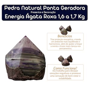 A Pedra Natural Ponta Geradora Energia Ágata Roxa, com peso entre 1,6 a 1,7 kg. Com sua deslumbrante coloração roxa, esta pedra oferece poderosas qualidades energéticas para promover equilíbrio, proteção e clareza mental. Benefícios da Ágata Roxa: