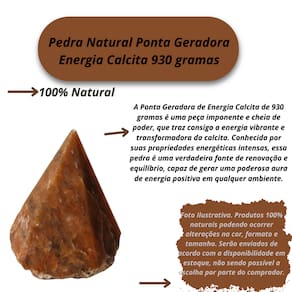 A Ponta Geradora de Energia Calcita de 930 gramas é uma peça imponente e cheia de poder, que traz consigo a energia vibrante e transformadora da calcita. Conhecida por suas propriedades energéticas intensas, essa pedra é uma verdadeira fonte de renovação e equilíbrio, capaz de gerar uma poderosa aura de energia positiva em qualquer ambiente. Com um formato geométrico e afiado, essa ponta de calcita atua como um gerador de energia, promovendo um fluxo constante de energias puras e benéficas. Seu tamanho e presença a tornam uma excelente escolha para ambientes maiores, consultórios, espaços de meditação ou para quem deseja fortalecer a energia do lar. Benefícios da Ponta Geradora de Energia Calcita (930 gramas):