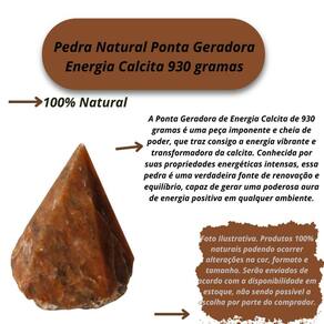 Pedra Natural Ponta Geradora Energia Calcita 930 gramas Pedra Natural Ponta Geradora Energia Calcita 930 gramas A Ponta Geradora de Energia Calcita de 930 gramas é uma peça imponente e cheia de poder, que traz consigo a energia vibrante e transformadora da calcita. Conhecida por suas propriedades energéticas intensas, essa pedra é uma verdadeira fonte de renovação e equilíbrio, capaz de gerar uma poderosa aura de energia positiva em qualquer ambiente. Com um formato geométrico e afiado, essa ponta de calcita atua como um gerador de energia, promovendo um fluxo constante de energias puras e benéficas. Seu tamanho e presença a tornam uma excelente escolha para ambientes maiores, consultórios, espaços de meditação ou para quem deseja fortalecer a energia do lar. Benefícios da Ponta Geradora de Energia Calcita 930 gramas : Aumento de Energia Positiva: A calcita é conhecida por ser um amplificador de energia. Ela eleva as vibrações do ambiente e de quem está ao seu redor, promovendo um fluxo contínuo de energia positiva. Propriedades de Limpeza Energética: A calcita ajuda a limpar energias estagnadas e negativas, criando um ambiente mais leve e harmonioso. É ideal para renovar as energias de espaços e pessoas. Ativação de Chakras: A calcita age como uma poderosa ferramenta de ativação e alinhamento dos chakras. Sua energia vibrante pode ser Utilizado para desbloquear e equilibrar os centros de energia do corpo, promovendo a cura física e emocional. Enviamos a sua encomenda em até 24 horas após a confirmação do pagamento Caso tenha alguma dúvida nos mande mensagem que responderemos rapidinho para te ajudar da melhor forma possível