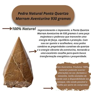 Impressionante e imponente, a Ponta Quartzo Marrom Aventurina de 930 gramas é uma peça majestosa e poderosa que transmite uma energia de força, equilíbrio e proteção. Com sua cor quente e acolhedora, essa pedra combina as propriedades curativas do quartzo e a energia vibrante da aventurina, tornando-a uma excelente escolha para quem busca transformação energética e prosperidade. Sua grande massa e beleza natural fazem desta ponta uma peça de destaque em qualquer ambiente. Seja como elemento decorativo, amuleto de proteção ou ferramenta de cura, ela possui um impacto tanto visual quanto energético. Benefícios da Ponta Quartzo Marrom Aventurina 930 gramas :