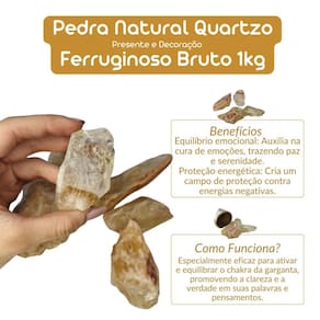 Pedra Natural Quartzo Ferruginoso Bruto 1 kilo Pedra Natural Quartzo Ferruginoso Bruto - 1kg O Quartzo Ferruginoso é uma pedra natural que combina a força do quartzo com a energia do ferro, tornando-se uma poderosa fonte de vitalidade, proteção e equilíbrio. No formato bruto, mantém sua energia intensa e autêntica, sendo ideal para colecionadores, terapeutas e entusiastas de cristais. Benefícios do Quartzo Ferruginoso