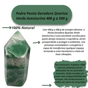 Apresentamos a Pedra Ponta Geradora Quartzo Verde Aventurina, com peso entre 400g a 500g. Com sua cor verde vibrante, esta pedra é altamente valorizada por suas propriedades de cura, equilíbrio e atração de energias positivas. Benefícios do Quartzo Verde Aventurina: