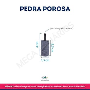 Especificações: - Marca: Mega Aquários - Modelo: Pedra porosa M1 - Material: Composto químico de silício e carbono. Conexão ponta de plástico - Tamanho: 2,5 x 1,5 - Altura total com a conexão: 4cm - Peso: 10g - Cor: cinza - Conexão de mangueira de ar: 4mm