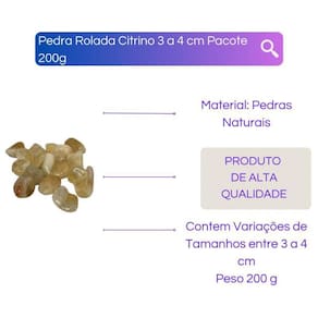 Pedra Rolada Citrino 3 a 4 cm Pacote 200g Pedra Rolada Citrino 3 a 4 cm Pacote 200g As Pedras Roladas Citrino da Bialluz proporcionam inúmeros beneficios para o seu corpo e para sua mente. Nossas pedras possuem funções terapêuticas e emanam boas energias em todo ambiente em que estiver localizada. São capazes de aumentar sua proteção energética, elevar seu foco, ajudar a atrair prosperidade e despertar capacidades superiores. Com tantos benefícios e beleza, nossas pedras também são ótimos itens decorativos e maravilhosas opções para presentear uma pessoa querida Enviamos o seu produto em até 24 horas após a confirmação de pagamento Dimensões aproximadas: Tamanhos das pedras: Entre 3 e 4 cm cada pedra Peso: 200 gramas o pacote total Nossas pedras são 100% naturais podendo ocorrer pequenas variações no formato e na tonalidade. Caso tenha alguma dúvida nos mande mensagem que respondemos rapidinho para te ajudar da melhor forma possível Marca: Meta Atacado