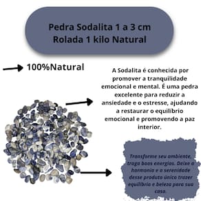 Tamanho Aproximado: As pedras incluídas no pacote possuem tamanhos variando entre 1 a 3 cm. Para garantir o peso de 1 Kg, o pacote será composto predominantemente por pedras de Sodalita de excelente qualidade, podendo conter também pedras de outros tipos de Sodalita ou cristais de qualidade similar, assegurando o peso anunciado.