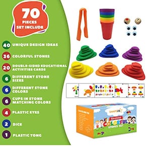 O conjunto de pedras arco-íris educacionais pré-k materiais de aprendizagem é incluindo 6 cores diferentes e 6 tamanhos diferentes de pedras de plástico, 36 no total. 20 cartões de atividades coloridos e frente e verso. Este conjunto de brinquedos também inclui 6 copos de cores correspondentes (Rede, Laranja, Amarelo, Verde, Azul, Roxo), 40 designs exclusivos, 2 dados, 1 pequena pinça de plástico, 4 olhos. O brinquedo educativo do conjunto de pedras arco-íris é convenientemente armazenado em um recipiente plástico.