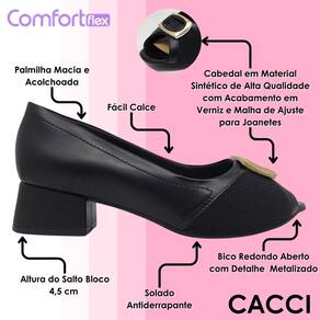 Esse sapato feminino estilo peeptoe da Comfortflex foi desenvolvido para oferecer estilo com total conforto. Seu design moderno traz um cabedal em material de alta qualidade com acabamento brilhante e aplicação de malha ajustável, que se molda suavemente aos pés, especialmente na região do joanete. O detalhe metalizado na parte frontal acrescenta um toque refinado ao visual.