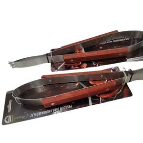 Fabricado em aço com proteção no cabo de madeira para não queimar as mãos, estes pegadores são utilizados pelo churrasqueiro para o manuseio das carnes na grelha. Suas garras nas extremidades e seu comprimento de 33cm garantem a maneira mais prática e fácil de preparar o seu churrasco.