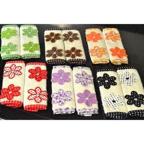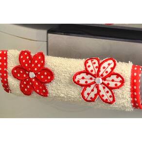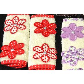 Fabricado em tecido atoalhado, na cor palha, com aplicação bordadas de duas florzinhas em tecido estampados, nas cores vermelho, preto, lilás, verde, marrom e laranja, acabamento em viés.