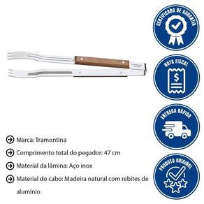 5. O pegador possui alguma garantia? Sim, o Pegador Para Carne Tramontina Churrasco tem 90 dias de garantia para vícios ou de fabricação. Tipo de pinça: Para carne | Cor: Cinza | Formato de venda: Unidade | Material do cabo: Madeira | Material da ponta: Aço inoxidável | Comprimento: 47 cm | É apto para lava-louças: Sim | Alimentos recomendados: Carne | É resistente ao calor: Sim | É antiaderente: Não | Unidades por Kit: 1 | EmbalagemAltura-cm: 4 | ProdutoAltura-cm: 2.4 | ProdutoLargura-cm: 8 | Altura Produto: 2.4 | Largura Produto: 8 | Dias Fornecedor: 1 | Modelo: Churrasco Inox E Madeira 47cm 26400101 | Marca: Tramontina | EmbalagemComprimento-cm: 12 | Peso Líquido: 0.0000 | EmbalagemLargura-cm: 49 | Cubagem: 0.005400 Ean: 7891112111851