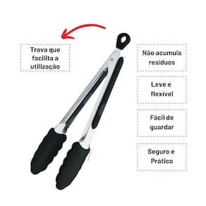 CARACTERÍSTICAS PRINCIPAIS Marca: UnHome Peso: 0,076 kg Tipo de Pinça: Para carnes, saladas, legumes Cor: Preto Material da alça: Aço Inoxidável Comprimento: 25,5 x 3,2 cm Material da ponta: Silicone