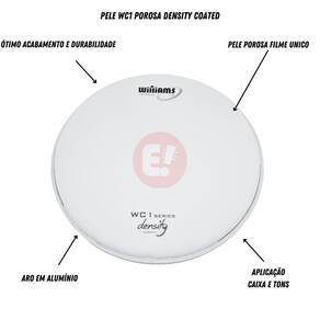 Pele porosa filme simples 10 mil de espessura Filme poroso clássico utilizado em caixas, tons ou surdos Sonoridade aberta com bastante volume e versatilidade Som com controle de excessos pela porosidade com boa densidade Semelhante a Remo Ambassador Coated e Evans G1 Coated acessíveis Williams é uma marca brasileira de peles importadas Pele acessível com bom custo x benefício Marca Williams
