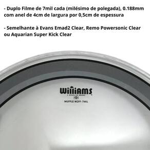 A pele para Bumbo Williams Muffle W2FF destaca-se pela sua durabilidade excepcional e pela capacidade de ressaltar as frequências graves do bumbo, proporcionando uma incrível projeção de som e volume. Com um anel interno de 4cm, essa pele oferece facilidade na afinação rápida e controle eficiente sobre os harmônicos indesejáveis. Adequada para diversos estilos musicais, como ReB, Rock, Metal, Gospel Music, Pop, Sertanejo, entre outros, a W2FF é uma escolha versátil. A espessura dupla de 7 mil 0,188 mm em cada filme, aliada ao anel controlador de harmônicos, proporciona uma resposta precisa e rápida. Semelhante a outras peles renomadas, como Evans Emad2 Clear, Remo Powersonic Clear ou Aquarian Super Kick Clear, a pele possui uma leve camada de óleo entre os filmes, preservando o som. Importante ressaltar que o produto inclui uma única pele para bumbo, indicada para músicos que buscam aprimorar a qualidade sonora de suas baterias com rapidez e precisão na afinação. Ótima durabilidade Excelente Custo e Beneficio Williams é uma marca brasileira de peles importadas Marca: Williams