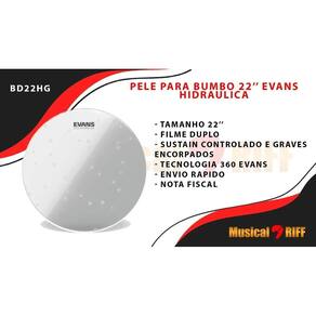 Pele bumbo 22 evans hidraulica transparente bd22hg Descrição do produto: Pele para bumbo 22 evans hidráulica glass bd22hg level 360 Hydraulic Pele de filme duplo, muito utilizada por bateristas que tocam pesado e que tocam muitas notas, responde muito bem em afinações baixas e médias, possui sustain controlado e graves encorpados devido a construção de filme duplo evitando que o som embole proporcionando mais definição. Perfeita estúdio, extremamente fácil de afinar devido à qualidade da construção e da tecnologia level 360 onde a pele se assenta de maneira uniforme por toda a extensão do tambor. - todos produtos são testados antes do envio - regulagem em instrumentos de corda são cortesia, não se aplicam bem como encordoamentos arrebentados não são cobertos na - cores dos produtos podem ter variação da foto para o produto real, principalmente violões em que as madeira tem variações de cor e veios da madeira. Marca: Não Informado