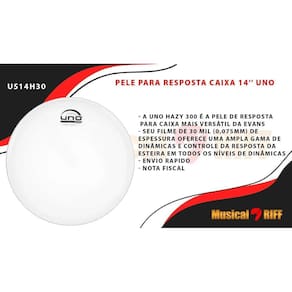 Pele de resposta caixa 14' uno us14h30 Todos produtos são com e do fabricante - todos produtos são testados antes do envio - regulagem em instrumentos de corda são cortesia, não se aplicam bem como encordoamentos arrebentados não são cobertos na - cores dos produtos podem ter variação da foto para o produto real, principalmente violões em que as madeira tem variações de cor e veios da madeira. Descrição do produto: A uno hazy 300 é a pele de resposta para caixa mais versátil da evans. Seu filme de 30 mil 0,075mm de espessura oferece uma ampla variedade de dinâmicas e controle da resposta da esteira em todos os níveis de dinâmicas. As peles uno são presas de forma plissada em um anel de alta qualidade. Prazos de troca e devolução: - o consumidor tem direto a troca ou devolução do produto com defeito dentro de 7 dias corridos, apos esse prazo é acionada a do fabricante - devoluções por arrependimento deve serm feitas com embalagem, todos itens que acompanham produto, e não deve haver havarias no produto, marcas de uso etc. Por isso tenha certeza do produto que está comprando o prazo para devoluçoes é de 7 dias Ean: 019954958787