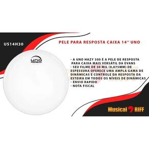 Pele de resposta caixa 14' uno us14h30 Todos produtos são com e do fabricante - todos produtos são testados antes do envio - regulagem em instrumentos de corda são cortesia, não se aplicam bem como encordoamentos arrebentados não são cobertos na - cores dos produtos podem ter variação da foto para o produto real, principalmente violões em que as madeira tem variações de cor e veios da madeira. Descrição do produto: A uno hazy 300 é a pele de resposta para caixa mais versátil da evans. Seu filme de 30 mil 0,075mm de espessura oferece uma ampla variedade de dinâmicas e controle da resposta da esteira em todos os níveis de dinâmicas. As peles uno são presas de forma plissada em um anel de alta qualidade. Prazos de troca e devolução: - o consumidor tem direto a troca ou devolução do produto com defeito dentro de 7 dias corridos, apos esse prazo é acionada a do fabricante - devoluções por arrependimento deve serm feitas com embalagem, todos itens que acompanham produto, e não deve haver havarias no produto, marcas de uso etc. Por isso tenha certeza do produto que está comprando o prazo para devoluçoes é de 7 dias