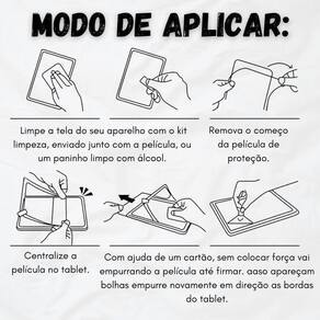 Modo de uso: 1- limpe a tela do seu tablet, após esta limpa remova uma parte da película protetora e centralize a película de cerâmica no tablet. Com a ajuda de um cartão, sem fazer força deslize para firmar por todo comprimento. Caso apareçam bolhas, empurre novamente em direção às bordas do tablet.