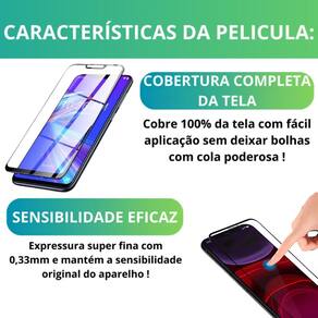 Descrição do produto: Película vidro temperado curvada - contorno protegido por uma camada de polietileno laminado; - proteção contra quedas, impactos e arranhões; - vidro temperado; - espessura de 0.3mm; - ótimo custo-benefício; - encaixe perfeito; - alta transparência; - este modelo possui 1mm a menos, para possibilitar o uso de capas. Conteúdo da embalagem: - 01 película de vidro temperado curvada - 01 kit de limpeza para aplicação. Homologação Anatel: 166292013501