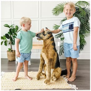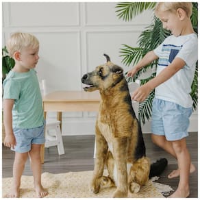 Este cachorro de pelúcia é um pastor alemão com a cabeça inclinada, feito de tecido macio e peludo com atenção aos detalhes. É construído resistente e possui uma estrutura interna que o mantém em pé. Não é destinado a ser utilizado como assento ou passeio.