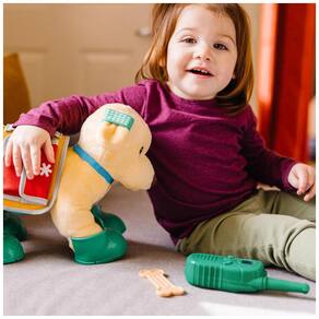 Crianças a partir de 3 anos podem brincar o dia todo com o Lets Explore Ranger Dog. O filhote de pelúcia é grande e adorável, e possui um colete de segurança, sapatos de proteção e equipamento de primeiros socorros. O brinquedo também inclui um walkie talkie com efeitos sonoros, bandagens, lenços umedecidos, guloseima para cachorro, um cartão de certificação, um livreto de atividades e um medalhão colecionável. O colete possui bolsos e clipes para armazenar peças de brincar, além de ser dimensionado para caber no cachorrinho e também como cinto para crianças.