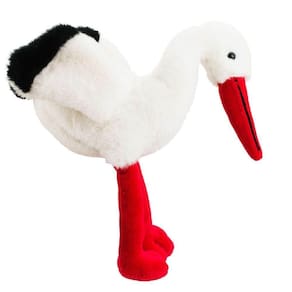 Design temático formato de cegonha branca com bico e patas vermelhas.