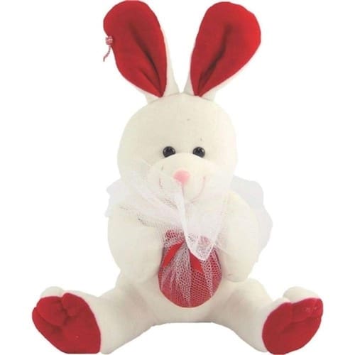 Coelhinho em Plush na cor Baunilha com detalhes em vermelho. Possui ovinho nas mãos. Ideal para decoração de cestas de Páscoa Produto Atóxico, Antialérgico e Lavável. Tecido: Plush (20% Poliéster e 80% Algodão). Enchimento: 100% Poliéster Siliconado