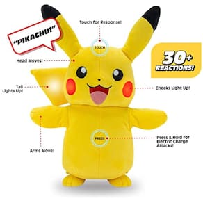 Carregue seu treinamento pokémon com Pikachu! Quando você quiser se unir e aconchegar sua pelúcia super macia, esfregue sua cabeça e ela vai falar. Quando estiver pronto para treinar para a batalha, segure sua barriga para lançar um ataque de trovão. Quanto mais tempo você aguentar, mais poderoso é o ataque. Cuidado com suas bochechas e cauda acesas enquanto você se torna amigo! Um produto Pokémon oficialmente licenciado. Adequado para idades de 3 anos ou mais.