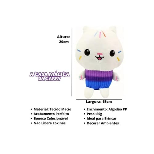 Com um design encantador e acabamento impecável, essa pelúcia é perfeita para colecionadores e amantes de itens fofos e divertidos.Se você procura por um presente especial ou apenas deseja adicionar um toque de doçura e aconchego ao seu lar, a Pelúcia Casa da Gaby é a escolha perfeita. Compre agora e comece a colecionar os mais diversos modelos da encantadora Casa Mágica da Gabby em pelúcia- Modelo: Pelúcia Cakey 20cm- Material: Tecido Macio com Enchimento em Algodão de polipropileno- Altura: 20cm- Largura: 15cm- Peso: 100g- Não Libera Toxinas- Resistente a quedas, não quebra se cair no chão- Produto Colecionável- Ideal para Todas as Idades- Produto perfeito para dormir abraçado Homologação Inmetro: CE-BRI/IQB 005170 55017/21-001 Marca: Não Informado Ean: 7898014362831