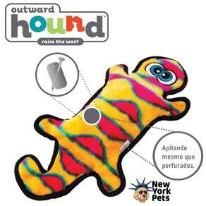 Brinquedo feito com material ultra resistente e durável com costuras reforçadas para uma diversão muito duradoura. Possui uma camada interna de tecido ultra reforçado K9 para formar um escudo de proteção. Sem recheio para não bagunçar a casa, caso rompido. Dedicado à cães de mordida moderada a forte. Possui apitos chamados “invincibles” que continuam apitando mesmo que perfurados. Seu corpo achatado e com os apitos encapados tornam um brinquedo ideal para lutas intermináveis e brincadeiras de cabo de guerra.