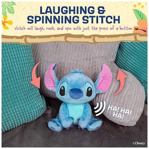 Apresentamos o pelúcia Laughing Stitch, o amigo carinhoso perfeito para seu filho se divertir. Com apenas um apertar de botão, Stitch irá rir, balançar e girar enquanto diz algumas de suas frases favoritas. Este brinquedo de pelúcia é uma ótima opção para presentear em votos de boa sorte, aniversários e muito mais Além disso, é um item colecionável e divertido para crianças, adolescentes e adultos. O detalhamento da pelúcia é incrível, com bordados precisos e orelhas grandes. Para ativar as funções, basta apertar o botão na almofada inferior direita da pata. Inclui 3 pilhas AAA e pode ser lavado na superfície. Compartilhe a alegria do alienígena azul favorito dos fãs da Disney com seu filho e crie lembranças novas e alegres para os próximos anos.