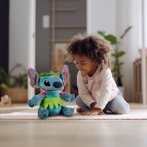 - 30cm de altura: tamanho ideal para abracar e brincar - Pelucia com mecanismo interativo - Emite sons divertidos e frases do Stitch - Bochechas com luz que se acendem ao interagir - Material antialergico e super macio - Detalhes bordados de alta qualidade - Roupa exclusiva - Funciona com 2 baterias LR44 -inclusas-