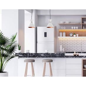 As luminárias pendentes têm um design moderno e elegante, combinando a cor branca com detalhes em cobre, o que confere um toque de sofisticação ao ambiente. Com medidas de 15x18cm, elas possuem o tamanho ideal para se destacarem na decoração, sem ocupar muito espaço.