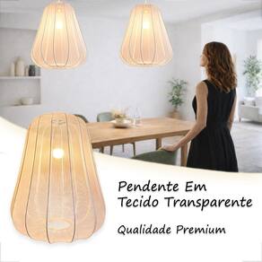 Confeccionado em tecido translúcido, permite a passagem suave da luz, criando um brilho difuso, acolhedor e elegante, sem ofuscar. O resultado é uma iluminação confortável, ideal para salas de jantar, salas de estar, quartos ou projetos que pedem um toque autoral e refinado.