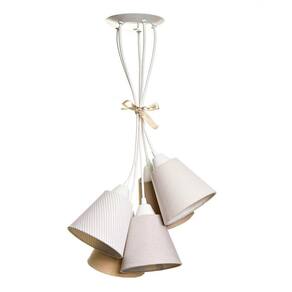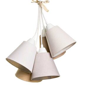 Opte pelo lustre com 5 lâmpadas para realçar a decoração do quarto do bebê e ao mesmo tempo adequar um efeito luminoso agradável. Se estiver à procura por iluminação e charme, esta é a solução Dados TécnicosPendente com 5 cúpulas confeccionadas em arame galvanizado e acetato forrado com tecido.Acompanha fiação completa com canopla de acabamento para o teto.A altura dos cabos elétricos pode ser regulada no momento da instalação. Lâmpadas SuportadasEconômicas/ Led: Qualquer LâmpadaIncandescente amarela : Até 40w por Soquete MedidasCada cúpula tem:Parte de cima: 8 cm de diâmetroParte de baixo: 14 cm de diâmetroAltura: 11 cmCabo: 90 cm de comprimentoCanopla: 15 cm de diâmetro