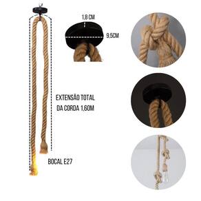 Especificação do produto: - Encaixe para duas lâmpadas - Tipo de Fiação: Fio PP 2 vias - Voltagem: 110/220V Bivolt - Fácil de Instalar - Cor da corda: Palha - Potência máxima recomendada por bocal: Até 20W - Soquete: Modelo E27 4A 250V - Canopla e base para fixação no teto: Metal - Material da Corda: Sisal