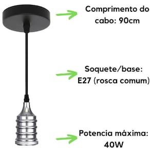 Pendente Dot Metal Wave Vintage Retro Cromado Taschibra Pendente Dot Metal Wave Cromado Taschibra Fabricante: Taschibra Cor: Cromado Canopla: Preto Soquete: E27 Potência: 40W Lâmpada não inclusa Material: Produzido em alumínio Dimensões: Diâmetro 5cm x Altura 9cm Voltagem: Bivolt Tamanho do Cabo: 90cm Regulável Altura Total Cabo + Cúpula : Aproximadamente 99cm : 3 meses para defeito de Fabricação. Marca: Não Informado Ean: 7897079087819