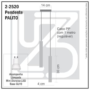 Pendente Palito DuploCom Design Slim este pendente é simples e lindo ao mesmo tempo. Proporciona uma luz focada e suave. Com cabo PP de 1 metro, regulador e canopla em metal esta luminária é uma tendência na iluminação. Descrição Técnica:- Modelo: PALITO DUPLO- Acabamento do corpo: PRETO- Material: Alumínio Usinado- Tamanho (LxAxP): 4cm x 30cm x 4cm - Cabo: PP com 1m (regulável)- Cor do Cabo: PRETO- Soquete: GU 10- Bivolt: Sim- Canopla: Em metal com 14cm, modelo plano e trava cabo regulador do cabo. **Lâmpadas vendidas separadamente**