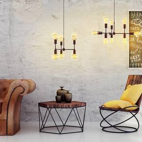 Pendente Equilibrium 9xE27 - Taschibra - Características Gerais do Produto: • Utilização: Interno • Dimensões do produto (cm): 68,5 x 68,5 x 23 • Potência: 40W (Por soquete) • Tipo soquete (base): E27 • Quantidade de soquetes: 9 • Acompanha lâmpada: Não • Produzido com: Alumínio, aço e plástico • Garantia: 03 meses • Comprimento do cabo (m): 1,1 • Observação:: Para que as peças mantenham o ponto de equilíbrio, distribua adequadamente o peso com lâmpadas equivalentes