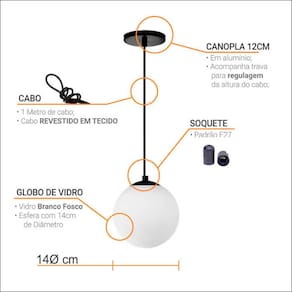 Inspirado no Design Vintage o pendente Globo transmite uma decoração sofisticada e dá um toque divertido ao espaço. Seu design minimalista com globo de vidro tira qualquer sala da mesmice. Uma peça diferenciada e muito elegante que fará toda a diferença no seu ambiente. Ideal para iluminações de centro de mesa, balcões, mesa de jogos entre outros. Descrição Técnica:- Modelo: GLOBO 14cm- Acabamento do Vidro: ÂMBAR- Acabamento da Base: COR OURO- Quantidade de soquetes: 1- Material: Vidro e Alumínio- Tamanho do Globo (LxAxP): 14cm x 14cm x 14cm - Cabo Revestido em tecido: 1m (regulável)- Soquete: E27- Bivolt: Sim- Canopla: Em metal com regulador **Não acompanha lâmpadas**